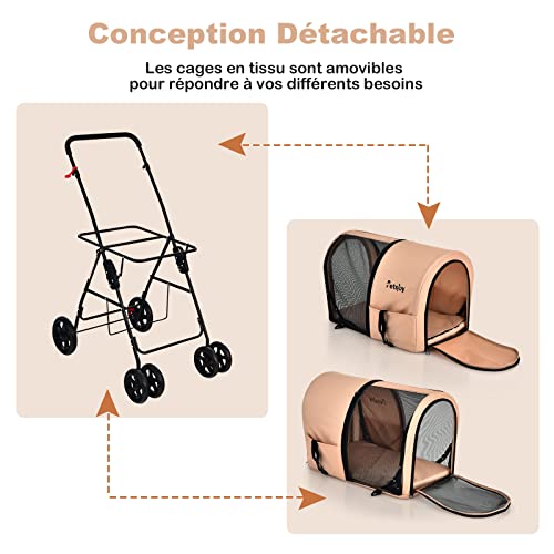 Une construction robuste en fer et en tissu oxford capable de supporter jusqu’à 16 kg, qui se plie d’une main et ne pèse que 8kg. Une fenêtre filet de nylon pour une bonne circulation d’air et une communication avec votre chien. De plus, 4 roues avant pivotantes à 360° résistantes à l’usure, 2 freins de sécurité des roues arrière, un intérieur en tissu oxford imperméable avec un coussin épais amovible pour le confort supplémentaire. Et enfin le nettoyage est facile puisque vous pouvez le faire à la machine ou à la main !