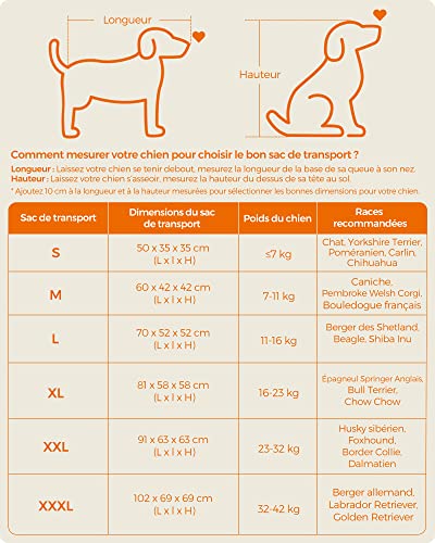 Ce sac de transport mesure 70 x 52 x 52 cm et convient parfaitement aux chiens de 11 à 16 kg tels que les cockers, les shetland sheepdogs, les beagles et les shibas. Grâce aux fenêtres en filet, votre animal préféré pourra admirer l’extérieur ! L’espace intérieur est suffisamment spacieux et confortable pour que votre compagnon ait une bonne expérience pendant le voyage. De plus, le cadre métallique assure la durabilité du produit. Un tissu Oxford résistant et un tapis moelleux sont inclus ; ce qui rend son nettoyage très facile avec une brosse douce. Et enfin, elle peut être pliée à plat si désirée ! Prête à protéger votre animal pendant le voyage ? Alors cette sacoche est faite pour vous !